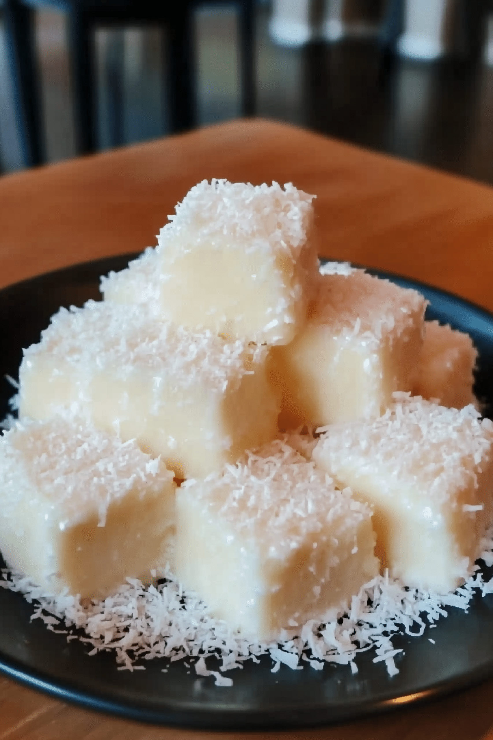Once cooled, cut the pudding into bite-sized pieces and roll each piece in shredded coconut. Serve chilled or at room temperature.