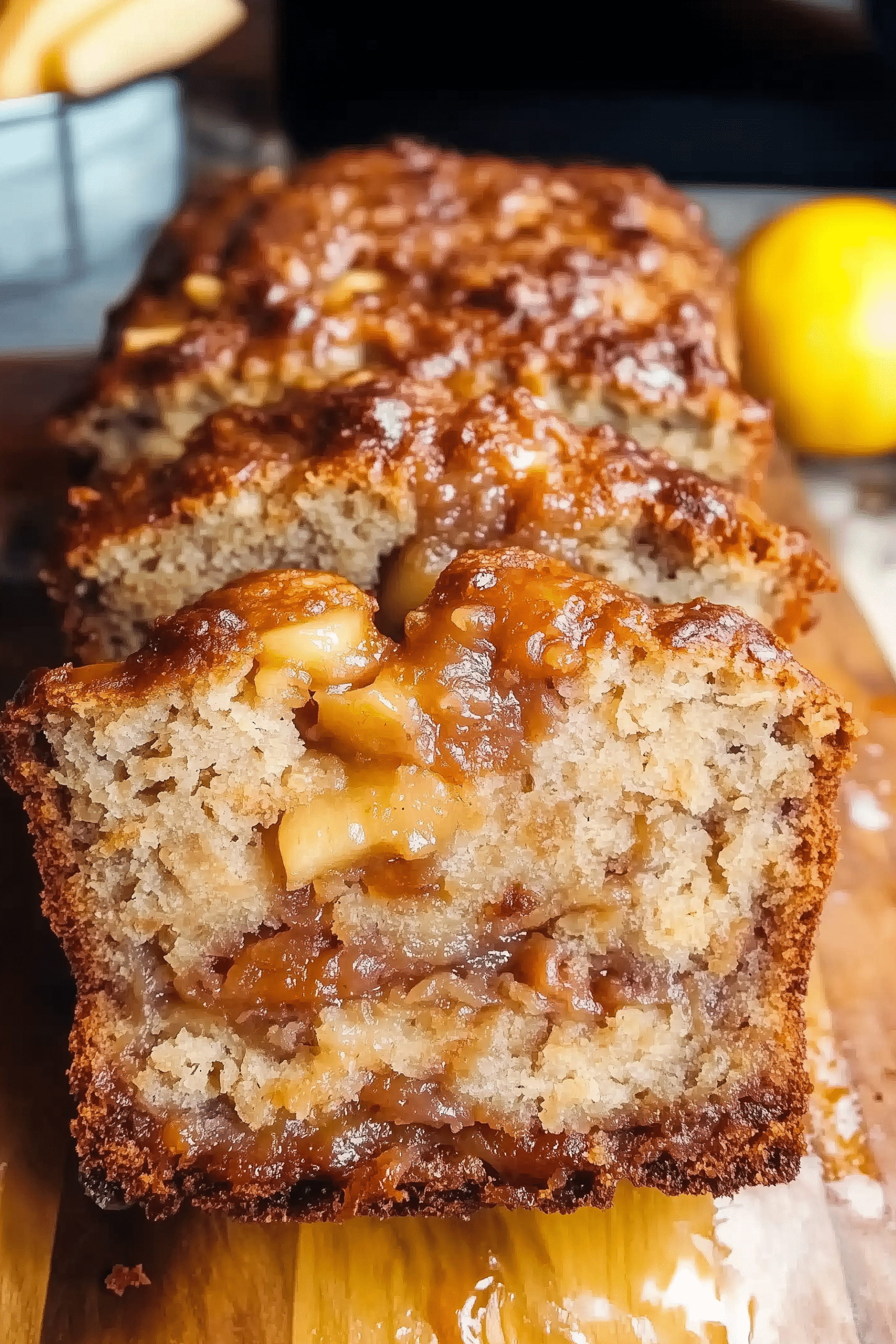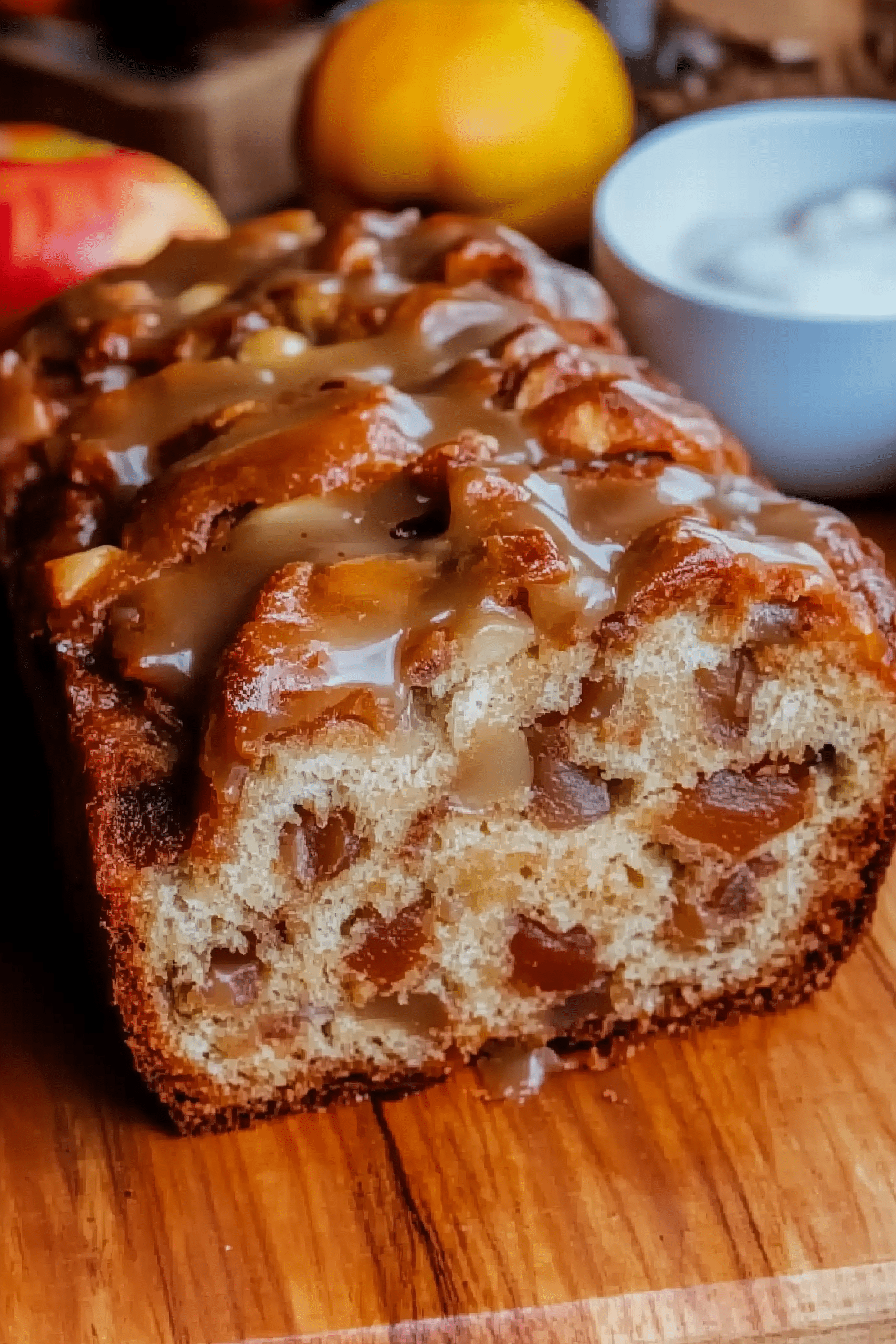 A cozy, cinnamon-spiced loaf bursting with tender apples and topped with sweet vanilla glaze.