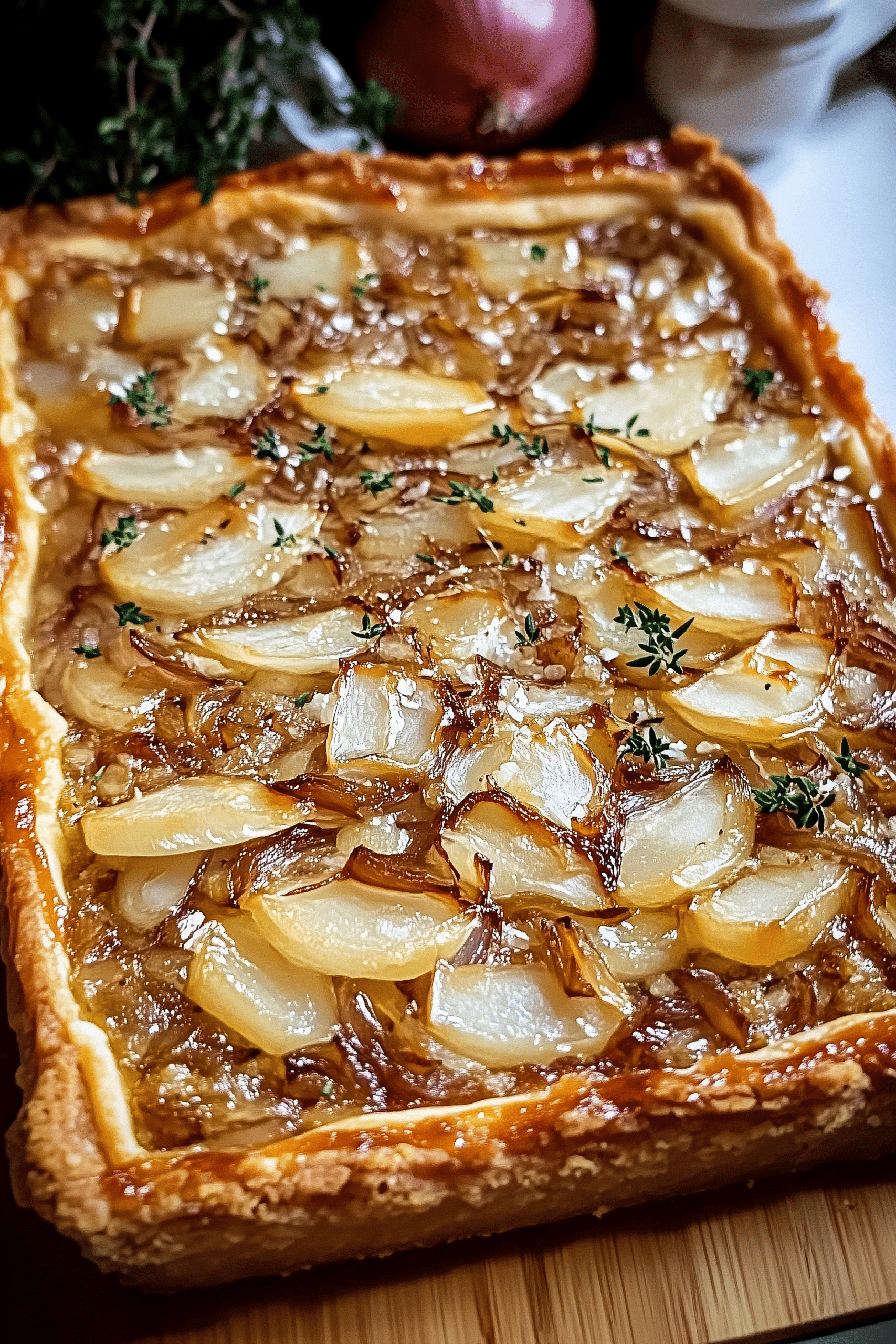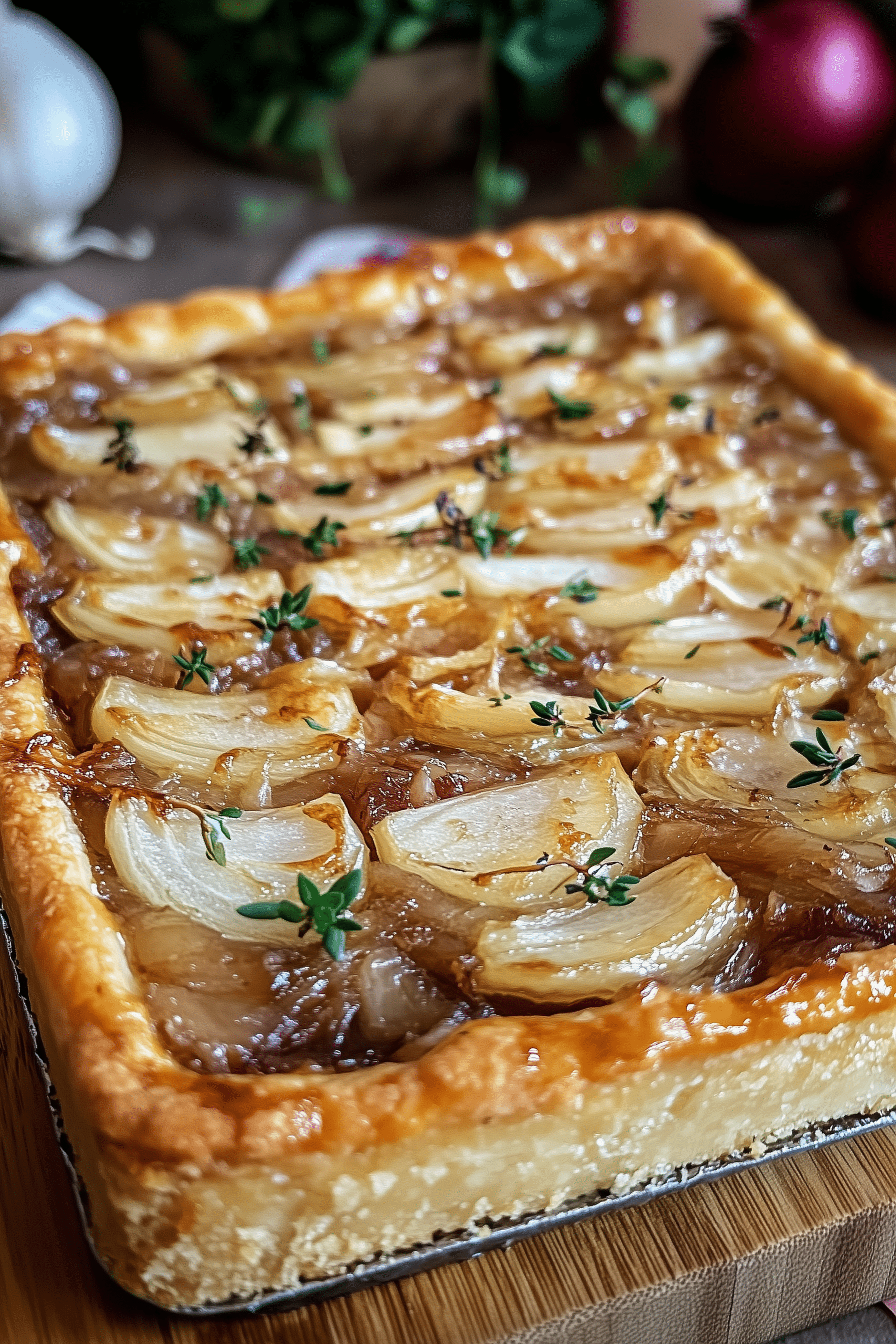 Buttery puff pastry topped with sweet caramelized onions, savory mushrooms, and melted cheese — an elegant, crowd-pleasing appetizer.