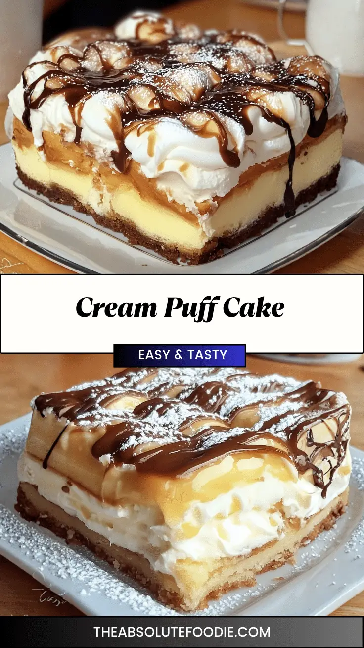 Cream Puff Cake takes everything you love about a classic cream puff and transforms it into a simple, crowd-pleasing sheet cake. The buttery crust puffs up beautifully in the oven, creating a light and hollow base for the rich, velvety vanilla cream cheese filling. Topped with whipped cream and a drizzle of chocolate, each bite is creamy, airy, and satisfyingly sweet. The best part? It’s incredibly easy to assemble and can be made ahead of time—ideal for entertaining or holidays.