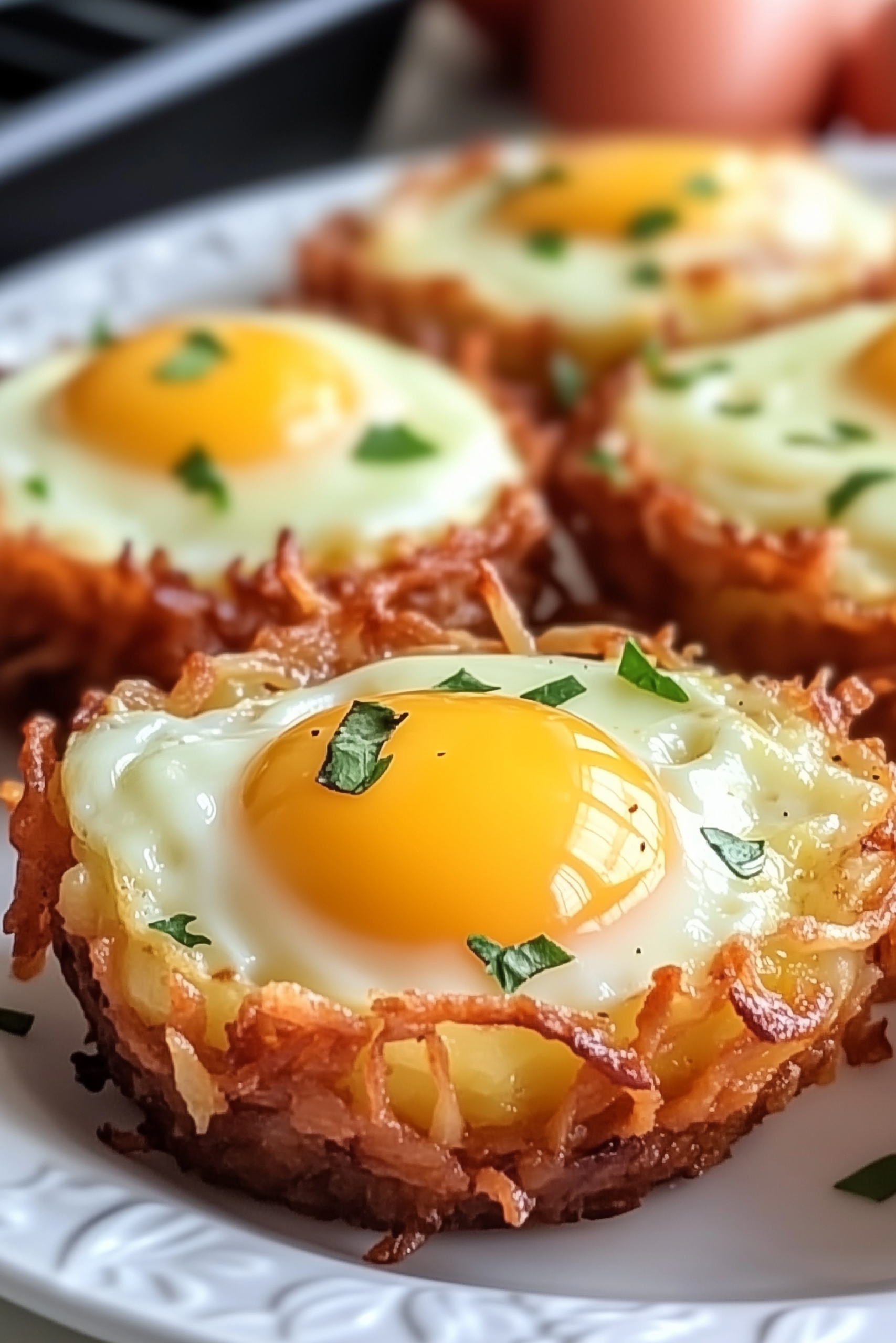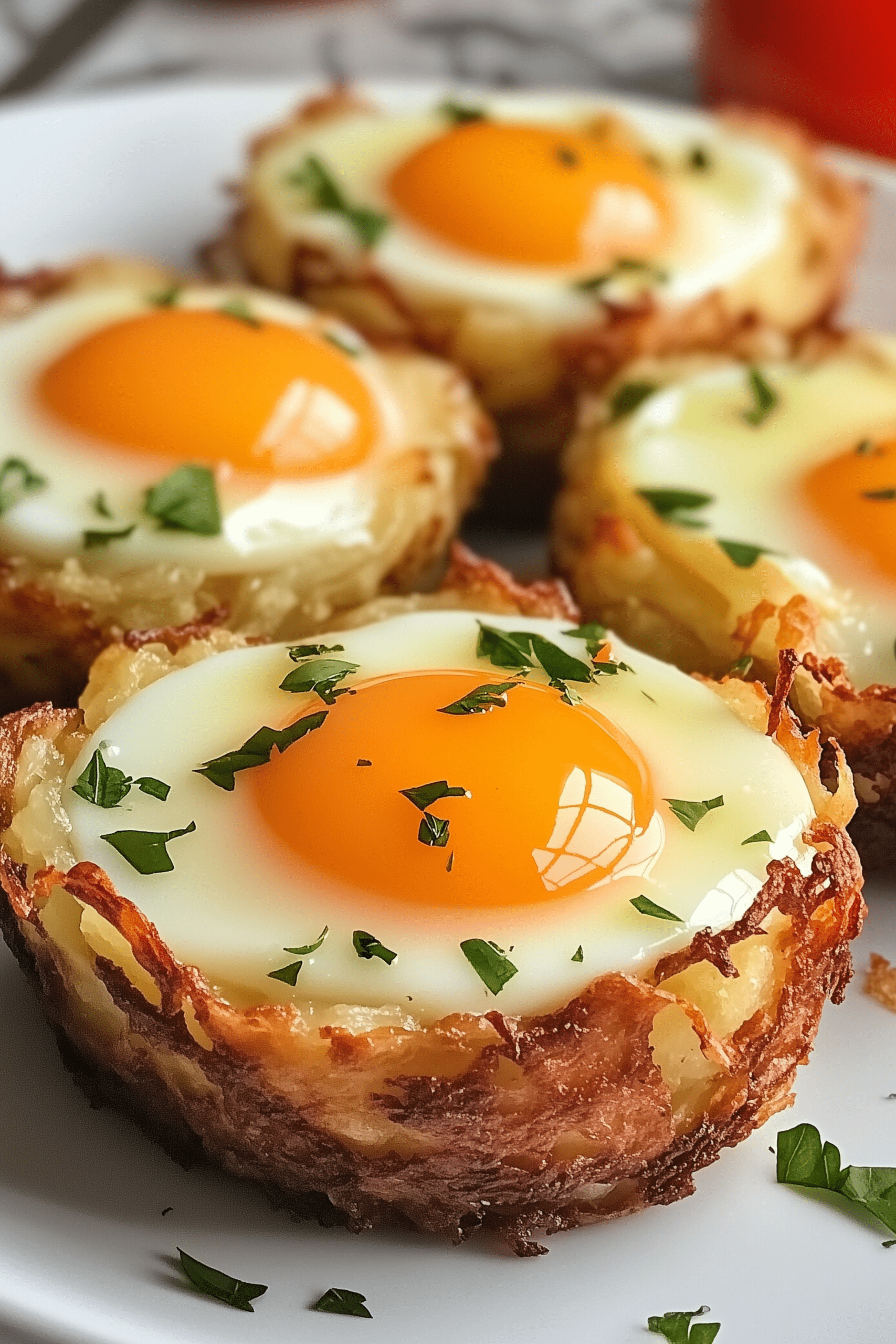 Eggs in Hash Brown Baskets are a creative twist on your favorite diner-style breakfast. Shredded hash browns are pressed into muffin tins to form golden, crispy nests that hold savory eggs and gooey melted cheese. These baked baskets are hearty, wholesome, and endlessly customizable—ideal for everything from casual mornings to elegant brunches.