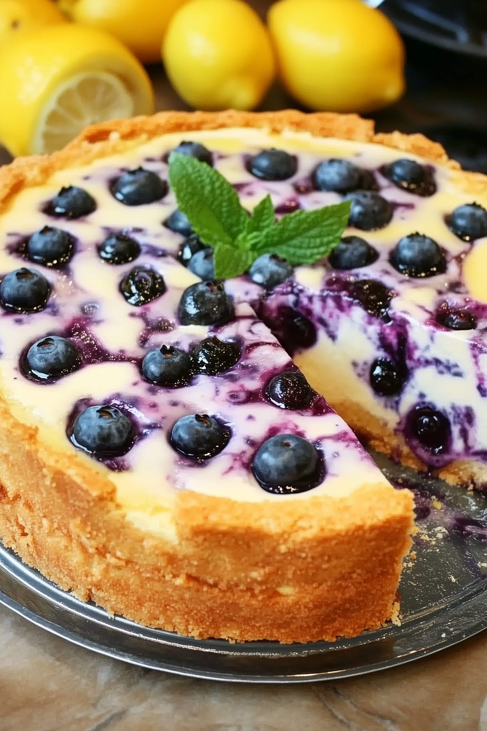 A zesty twist on a classic dessert with a fresh blueberry swirl and rich lemony flavor.