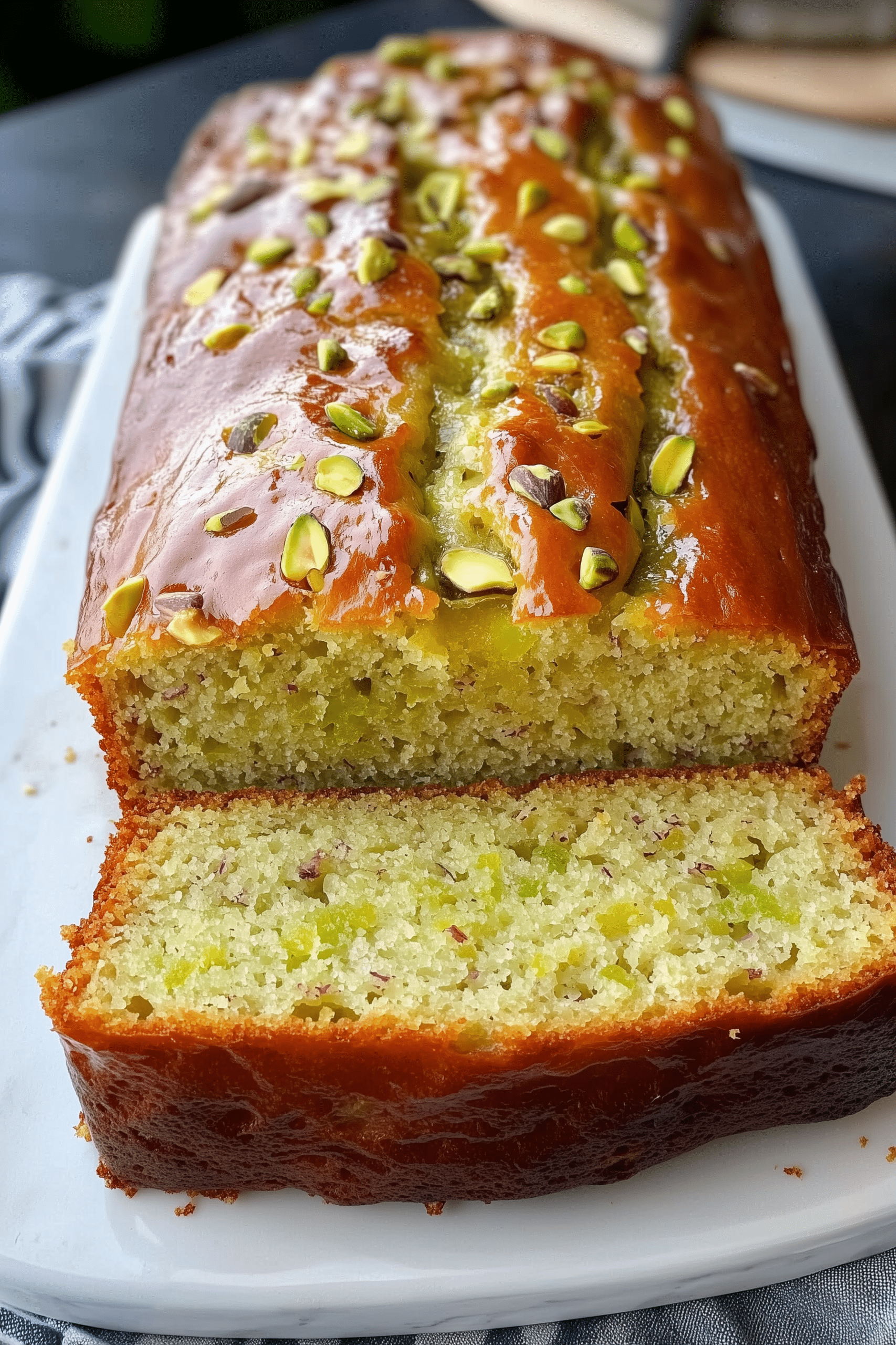- Drizzle glaze over cooled bread and sprinkle with reserved pistachios.
